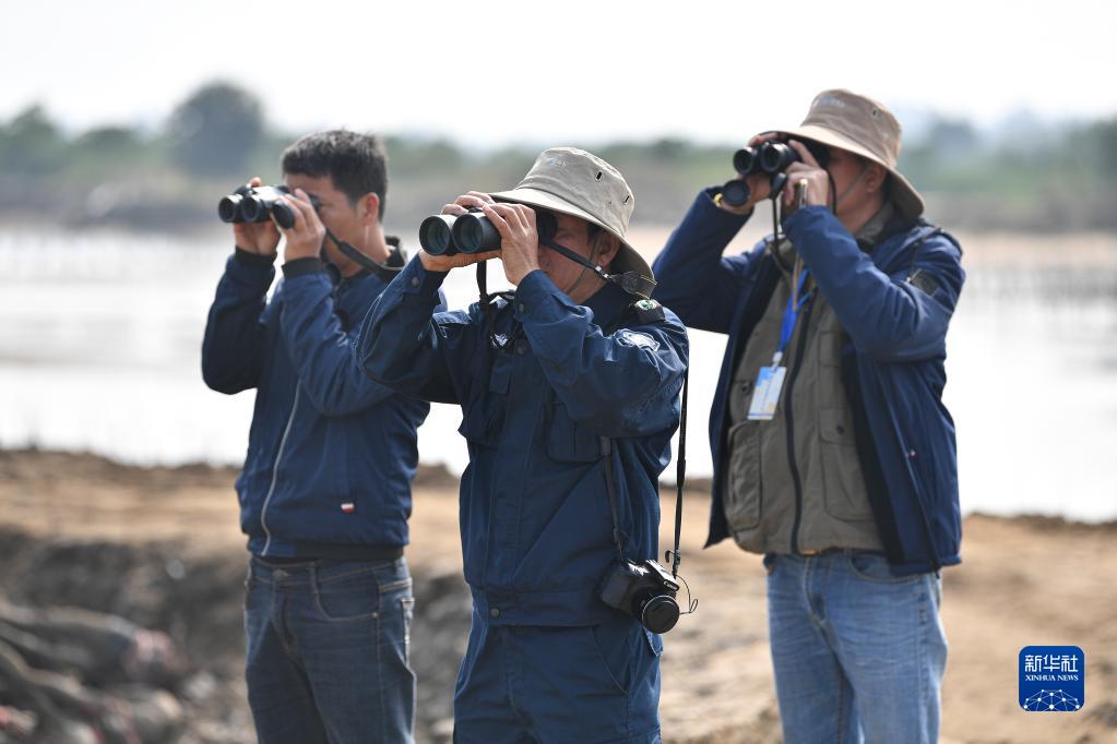 儋州灣濕地護鳥(niǎo)隊隊員在儋州灣巡護、觀(guān)測鳥(niǎo)類(lèi)(12月11日攝)。