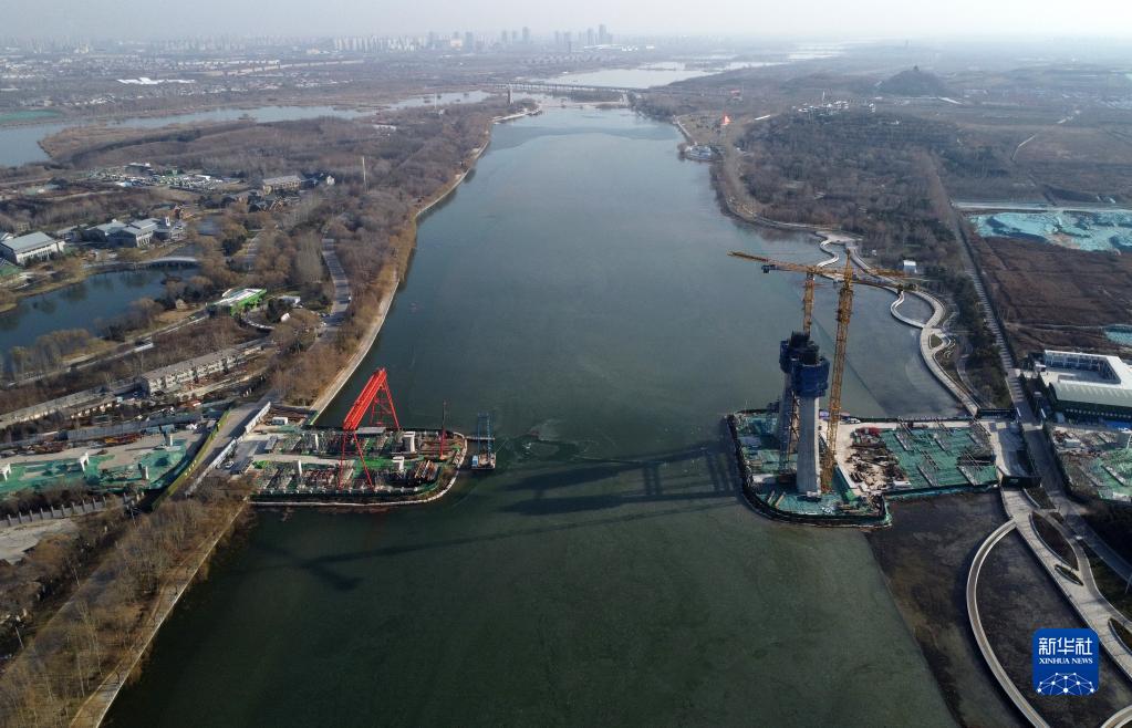 12月15日,工人在石家莊市太平河片區工程學(xué)府路東延跨太平河大橋建設工地施工(無(wú)人機照片)。