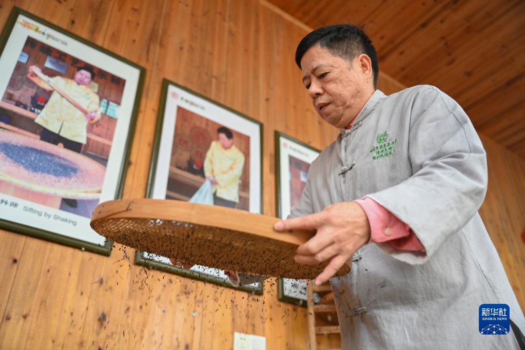 12月16日,在福州茉莉花茶制茶工坊,福州茉莉花茶傳統窨制工藝大師傅天甫進(jìn)行制茶的第二道工序“抖”?!岸丁笔菍⒉枞~分出曲直圓扁。