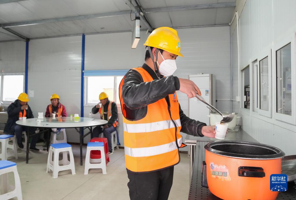 12月17日,在位于上海市普陀區的中建三局三公司安裝分公司項目工地上,工人在取用熱姜茶。