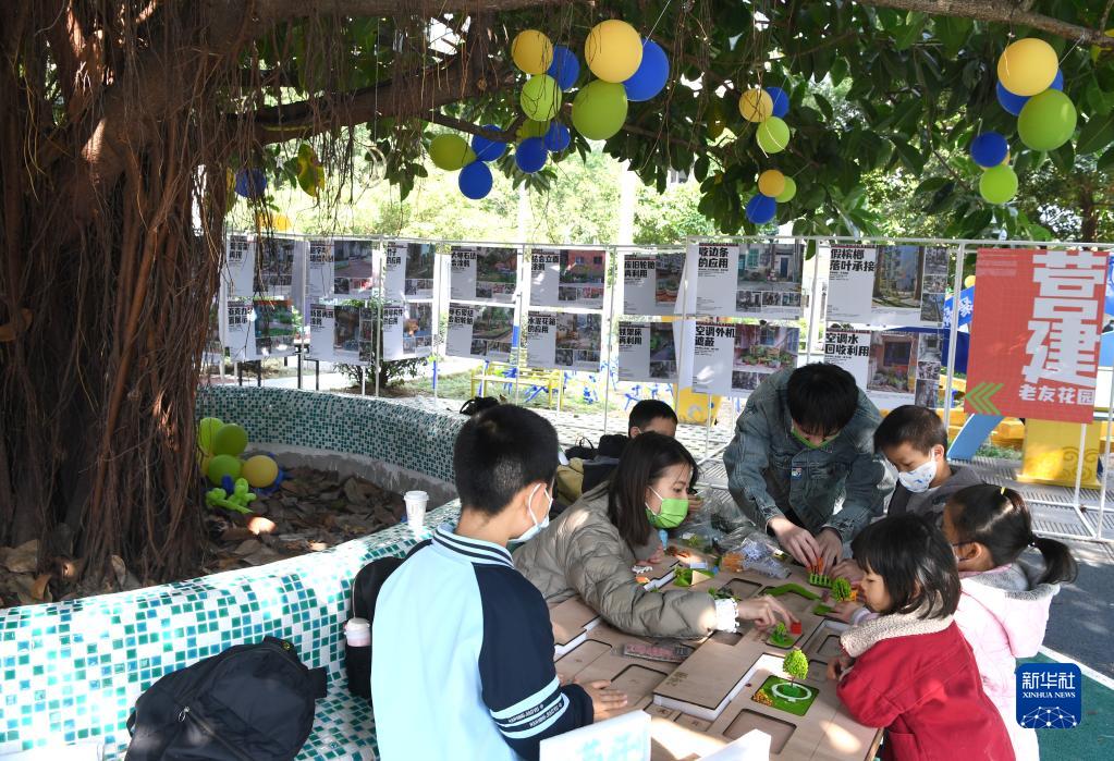 12月17日,孩子們在南寧市青秀區南湖小區改造后的中心花園做手工。
