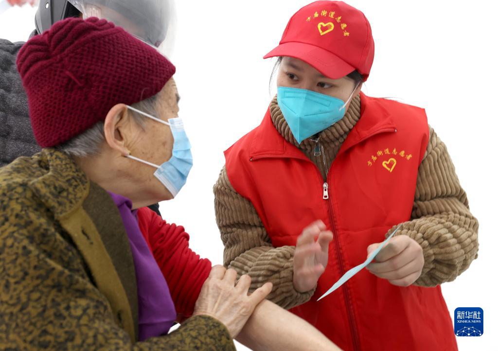 12月10日,在安徽省合肥市瑤海區方廟街道新冠疫苗接種點(diǎn),方廟街道志愿者汪亞婷(右)給一名接種新冠疫苗的老人講解疫苗接種注意事項。