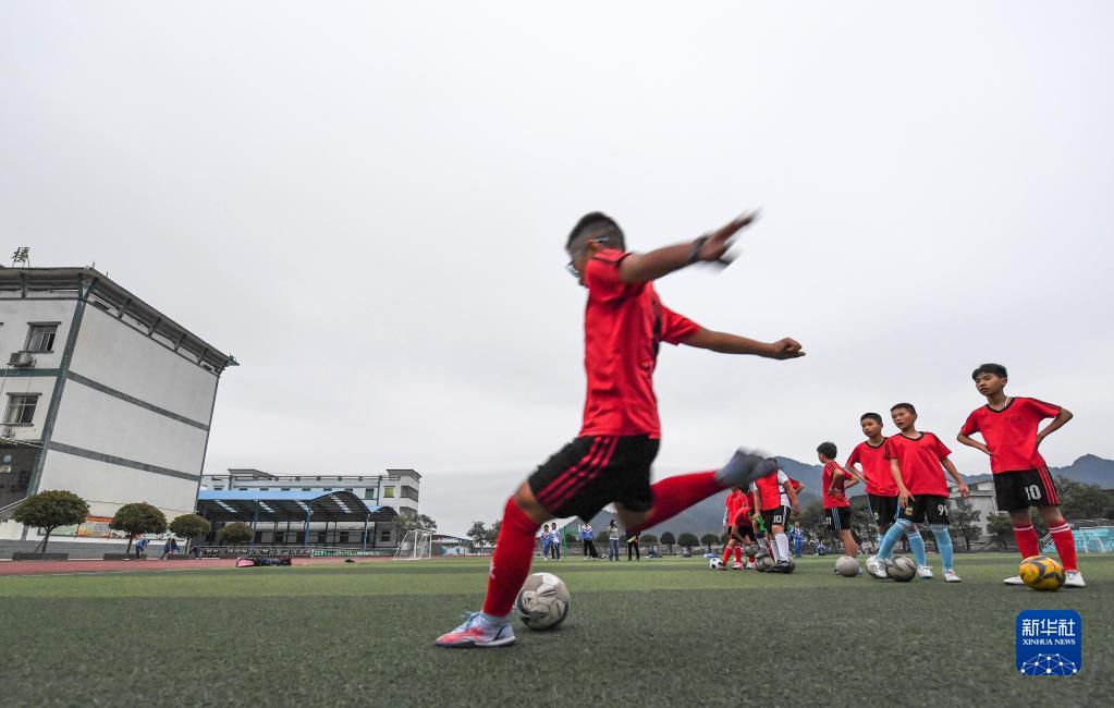在貴州省丹寨縣城關(guān)第一小學(xué),金粲璨(前)在參加足球基本功訓練時(shí)練習點(diǎn)球(11月15日攝)。
