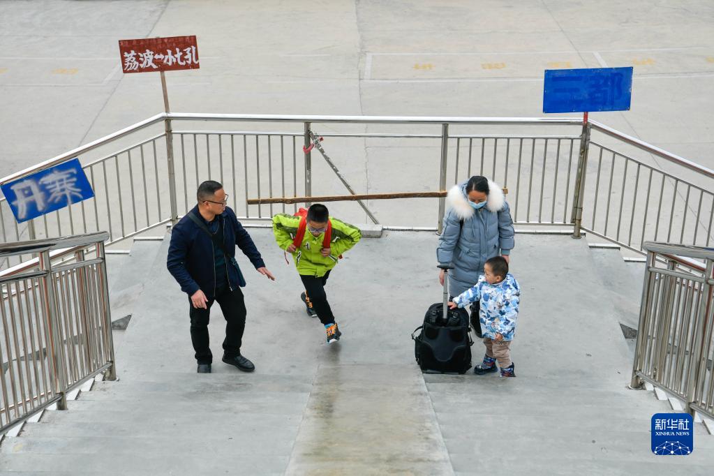 金粲璨(左二)在家人的陪護下前往貴州三都站轉高鐵出行(12月13日攝)。