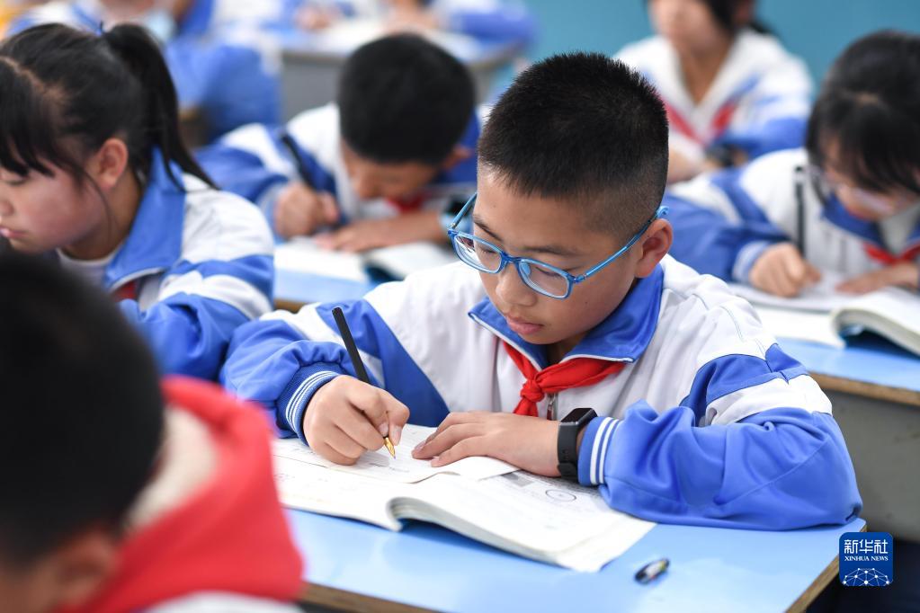 在貴州省丹寨縣城關(guān)第一小學(xué),金粲璨(前右)在課堂上學(xué)習(11月15日攝)。