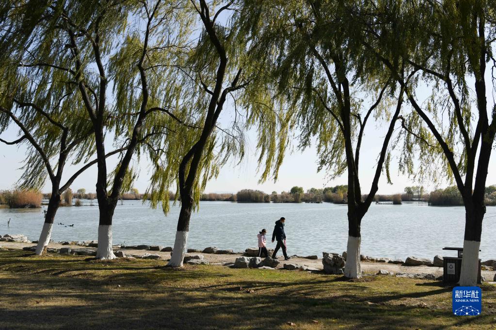 12月18日,市民在安徽合肥巢湖湖濱國家濕地公園休閑。