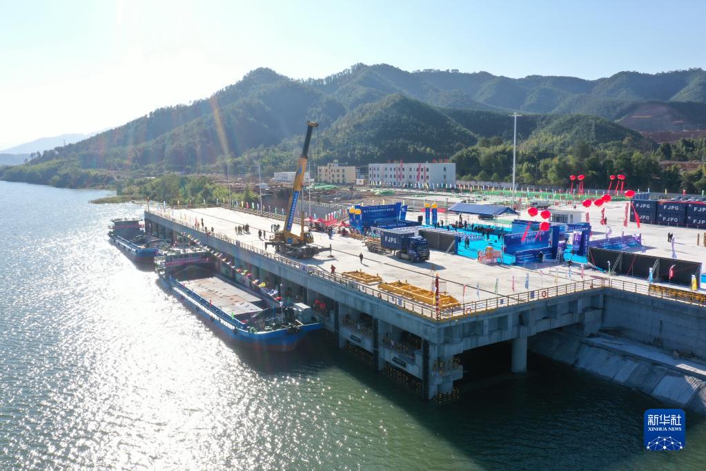 12月18日,“武夷2號”新能源貨船??吭谀掀礁垩悠叫鲁歉蹍^洋坑碼頭裝運貨物(無(wú)人機照片)。