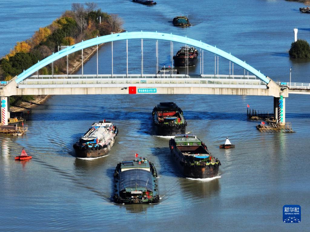 入冬以來(lái),在京杭大運河江蘇揚州段,裝載煤炭、鋼材、建材等貨物的船舶在航道上有序航行,來(lái)往如梭,運河上呈現一派繁忙景象。