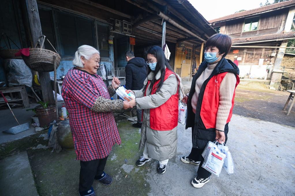 為了保證這些老年人的身體健康,東白湖鎮各村都組建了由村里的黨員、干部、鄉賢等組成的愛(ài)心志愿團隊,籌集退燒藥、抗原檢測試劑、消毒液、口罩等防疫物資,分送給行動(dòng)不便及年老體弱的老人們。同時(shí),鎮衛生院的家庭醫生還為老人及留守兒童提供免費上門(mén)看診、健康監測等服務(wù)。