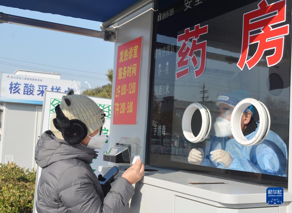 12月19日,在山東省棗莊市臺兒莊區興中廣場(chǎng),市民在一處發(fā)熱診室取藥。