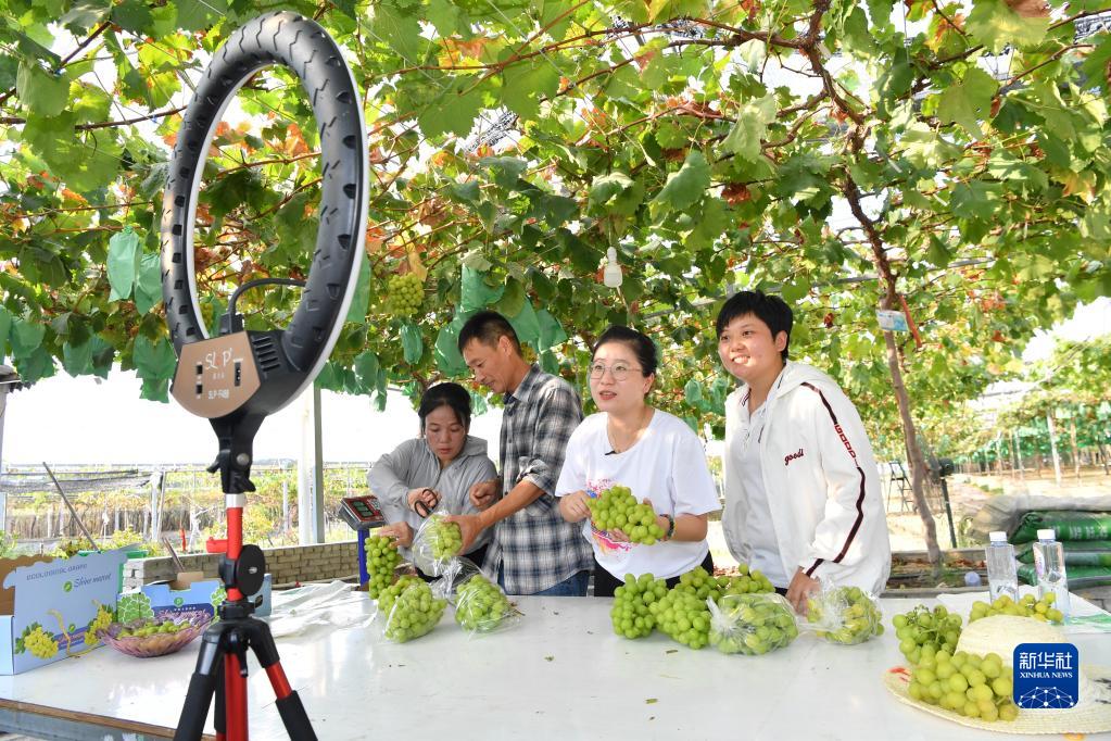 8月9日,在福建省福安市賽岐鎮象環(huán)村的葡萄種植園,返鄉創(chuàng )業(yè)大學(xué)生林恩輝(右二)、陳莉瑾(右一)在推銷(xiāo)剛采摘的葡萄,一旁的果農陳招旺夫婦在裝箱。