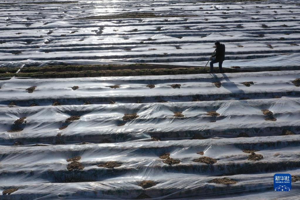 12月21日,河南省焦作市溫縣黃河街道東張王莊村農民在田間為農作物覆蓋地膜(無(wú)人機照片)。