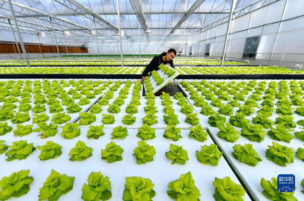 12月21日,菜農在湖北省宣恩縣椒園鎮鑼圈巖村一處蔬菜溫控大棚里管理水培蔬菜。