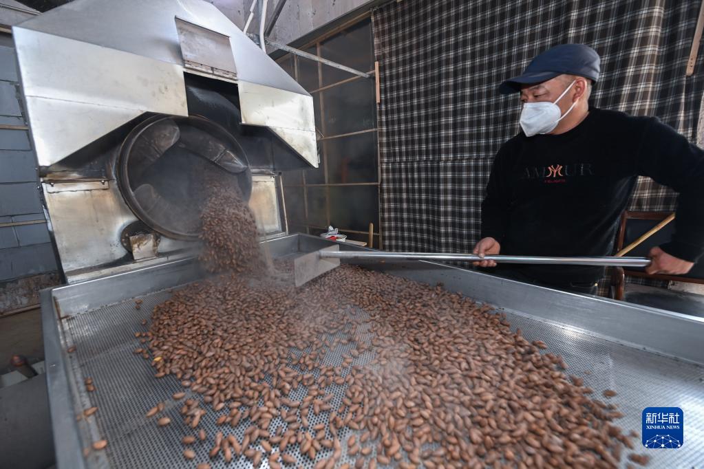12月21日,在諸暨市趙家鎮趙家社區趙三自然村的一家香榧加工點(diǎn),工作人員在炒制香榧。
