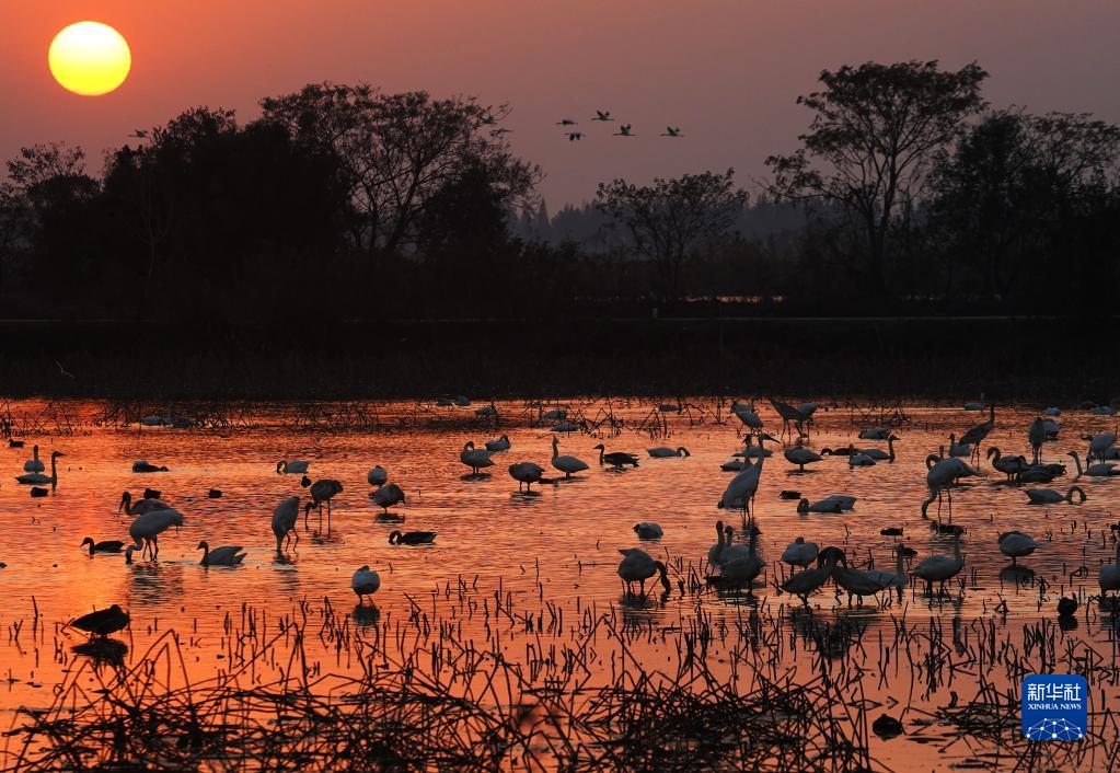 在鄱陽(yáng)湖畔的五星白鶴保護小區,成百上千只候鳥(niǎo)歡快地嬉戲覓食,享受著(zhù)鄱陽(yáng)湖畔的冬日暖陽(yáng)。鄱陽(yáng)湖今年遭遇持續干旱,為保護越冬候鳥(niǎo),愛(ài)鳥(niǎo)人士將候鳥(niǎo)常來(lái)的藕塘租下來(lái),擴建五星白鶴保護小區,周邊的稻田也只種不收,留給候鳥(niǎo)作食物……這一系列舉措保障了候鳥(niǎo)在此棲息越冬。