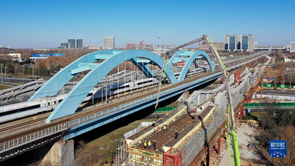 12月22日,中鐵十局的工作人員在對濟鄭高鐵跨濟南經(jīng)十西路槽型梁進(jìn)行合龍作業(yè)(無(wú)人機照片)。