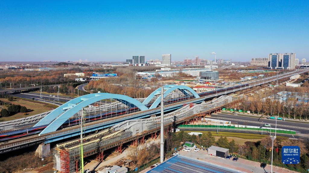 12月22日,中鐵十局的工作人員在對濟鄭高鐵跨濟南經(jīng)十西路槽型梁進(jìn)行合龍作業(yè)(無(wú)人機照片)。