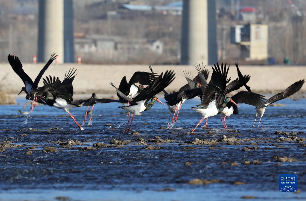 12月22日,一群黑鸛在河北省井陘縣境內的綿蔓河嬉戲。