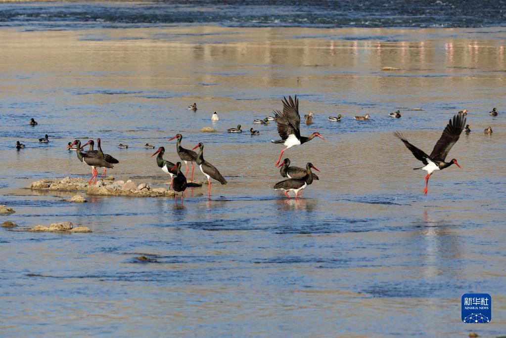 12月22日,一群黑鸛在河北省井陘縣境內的綿蔓河覓食。