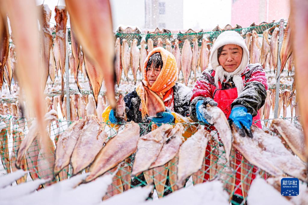12月22日,在山東省榮成市石島管理區王連街道北橋頭村一處漁家院,農戶(hù)在整理晾制的魚(yú)干。