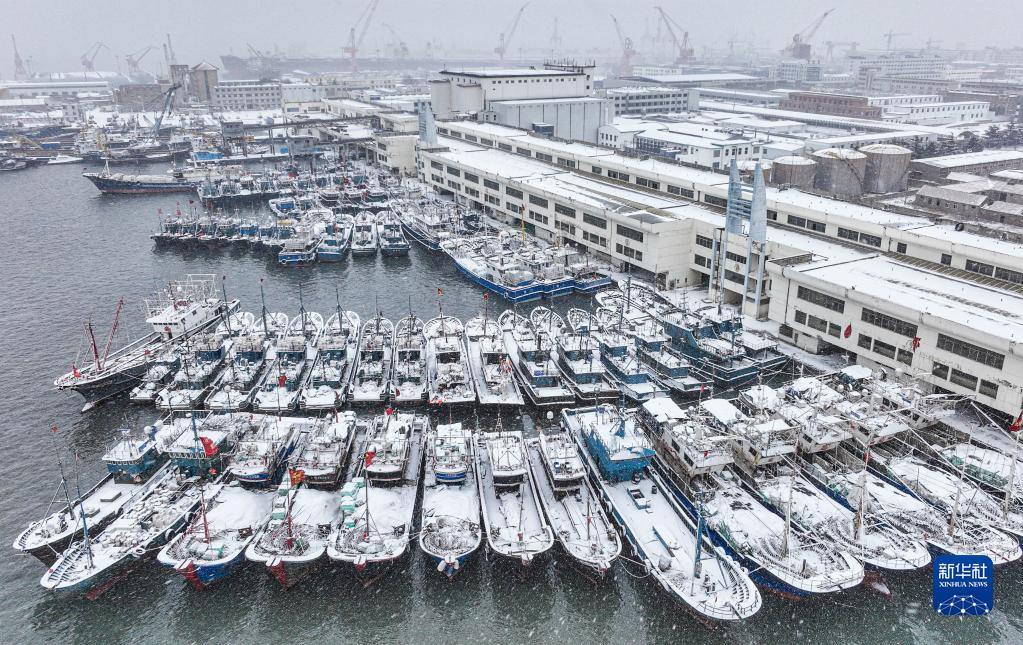12月22日,漁船??吭谏綎|省榮成市石島管理區石島漁港躲避暴風(fēng)雪(無(wú)人機照片)。