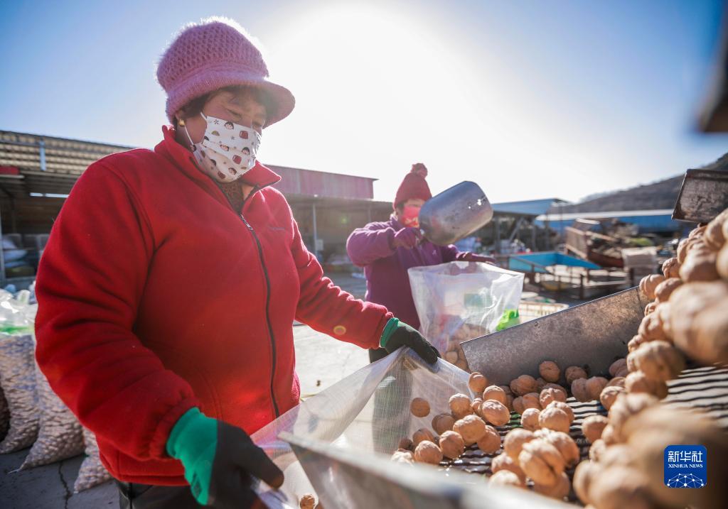 12月23日,農民在遵化市東舊寨鎮石橋頭村一家核桃專(zhuān)業(yè)合作社的場(chǎng)院裝核桃準備外運。