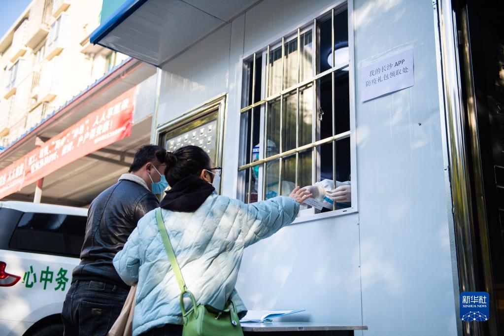 12月23日,在長(cháng)沙市湘江新區望岳街道社區衛生服務(wù)中心,市民在領(lǐng)取防疫健康包。