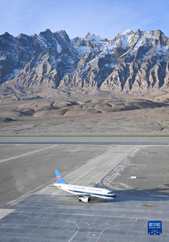 12月23日,在塔什庫爾干紅其拉甫機場(chǎng)的跑道上,首航航班在滑行。