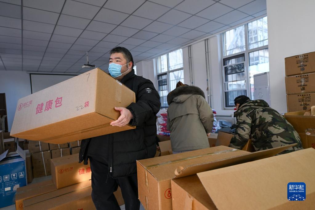 12月23日,在天津市河東區東新街道物資存放處,街道工作人員搬運“健康防疫包”。