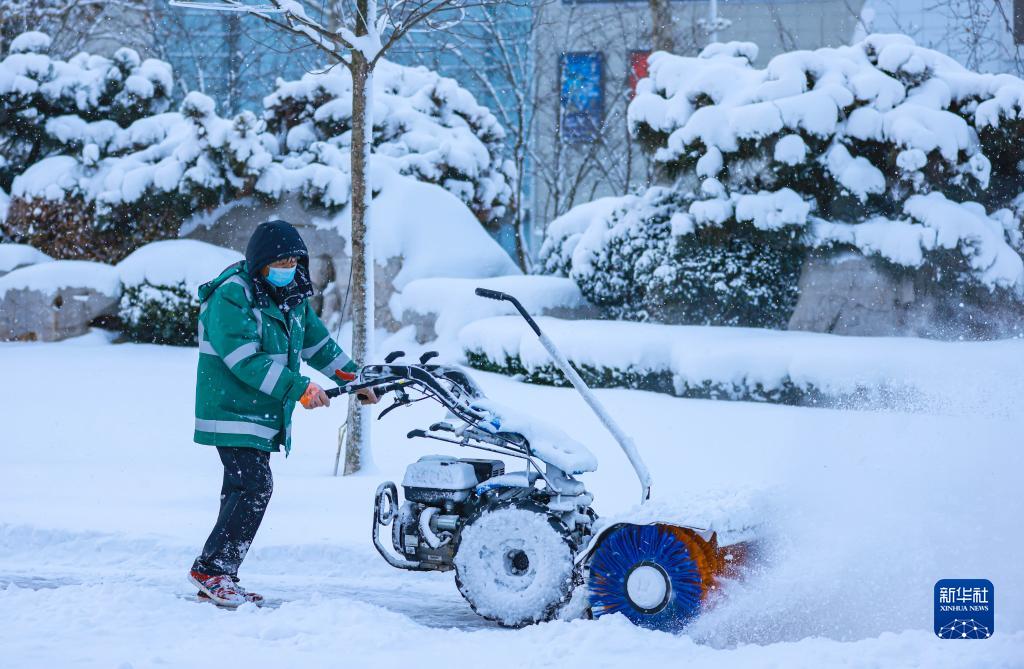12月23日,工作人員在山東省榮成市街頭清雪。