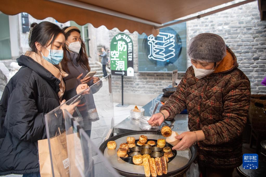 12月24日,在位于重慶解放碑商圈的著(zhù)名景點(diǎn)山城巷,游客購買(mǎi)當地特色小吃。