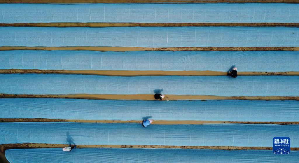 4月26日,村民在貴州省黔東南苗族侗族自治州臺江縣臺盤(pán)鄉陽(yáng)芳村水稻育秧基地管護水稻秧苗(無(wú)人機照片)。