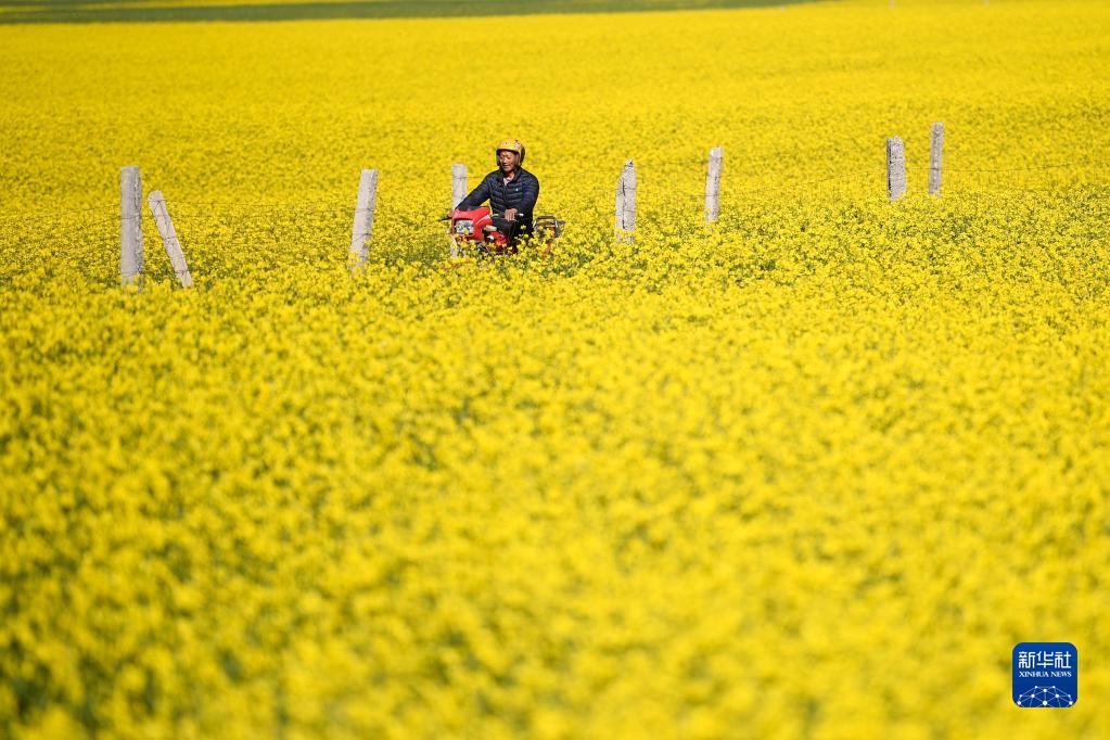 7月3日,在青海省海北藏族自治州門(mén)源回族自治縣,蜂農騎著(zhù)摩托穿過(guò)油菜花田。