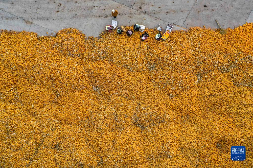 11月1日,農民在吉林省公主嶺市環(huán)嶺街道土城子村志和農機服務(wù)專(zhuān)業(yè)合作社內分揀收獲的玉米,準備進(jìn)行下一步的儲存工作(無(wú)人機照片)。