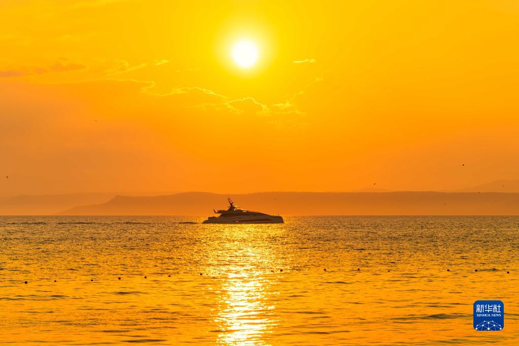 這是7月6日在俄羅斯符拉迪沃斯托克拍攝的落日余暉中的游艇。