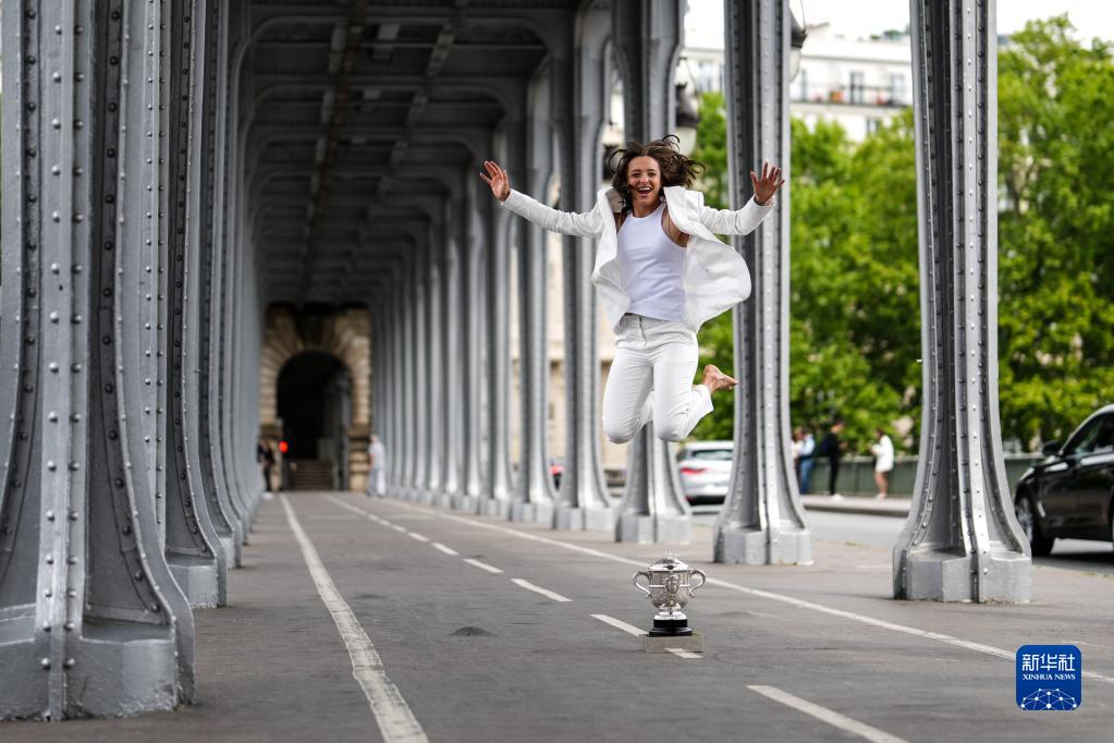 這是2022年6月5日,法國網(wǎng)球公開(kāi)賽女子單打冠軍、波蘭選手斯維亞特克在巴黎比爾哈克姆橋與冠軍獎杯合影留念。