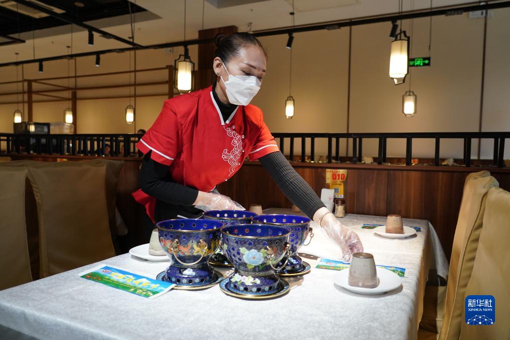 在北京世紀金源購物中心的一家餐廳,工作人員擺放餐具(12月25日攝)。