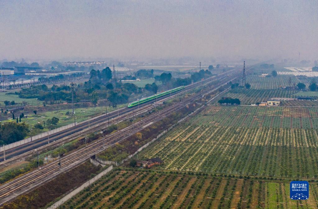 12月26日,新成昆鐵路首發(fā)列車(chē)行駛在四川省眉山市彭山區(無(wú)人機照片)。