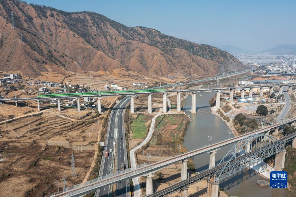 12月26日, C43次列車(chē)行駛在新成昆鐵路上,這段鐵路跨越安寧河和 G5京昆高速公路(無(wú)人機照片)。