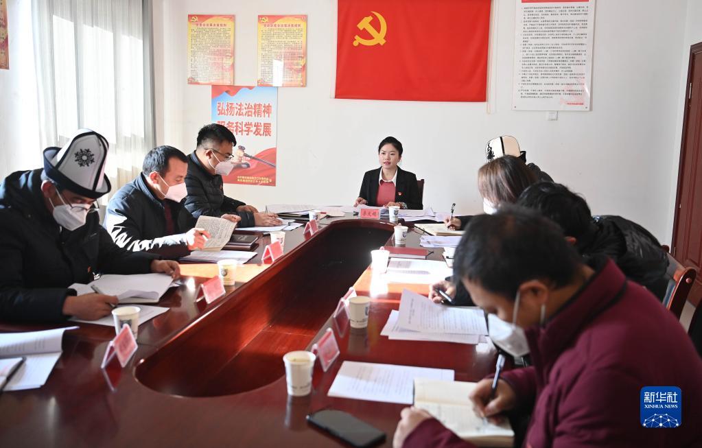 在新疆克孜勒蘇柯?tīng)柨俗巫灾沃莅⒖颂湛h布倫口鄉,李文娟(中)和同事們召開(kāi)專(zhuān)題討論會(huì ),學(xué)習黨的二十大精神(12月16日攝)。