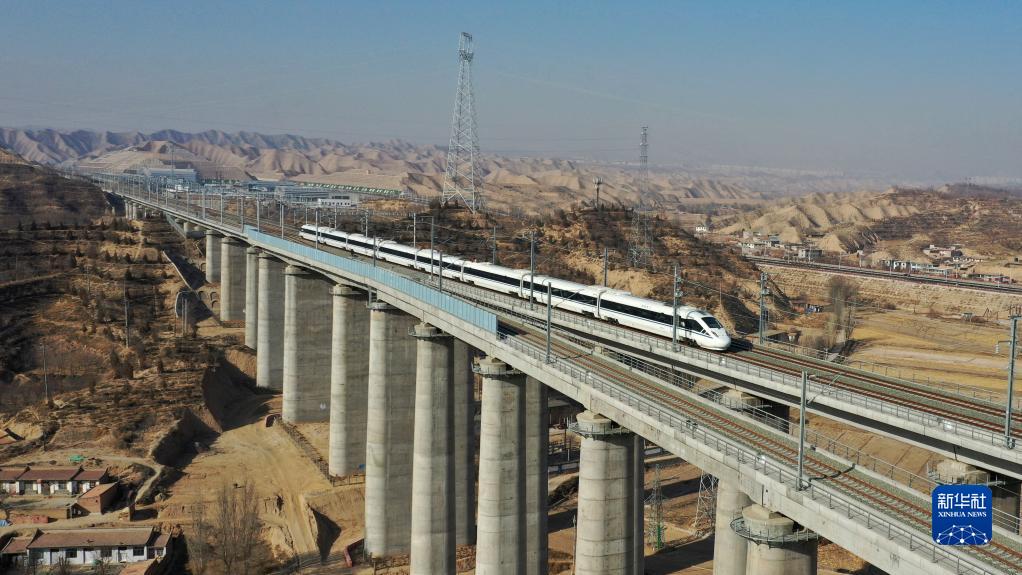12月26日,一趟試運行動(dòng)車(chē)組列車(chē)在銀蘭高鐵上行駛(無(wú)人機照片)。
