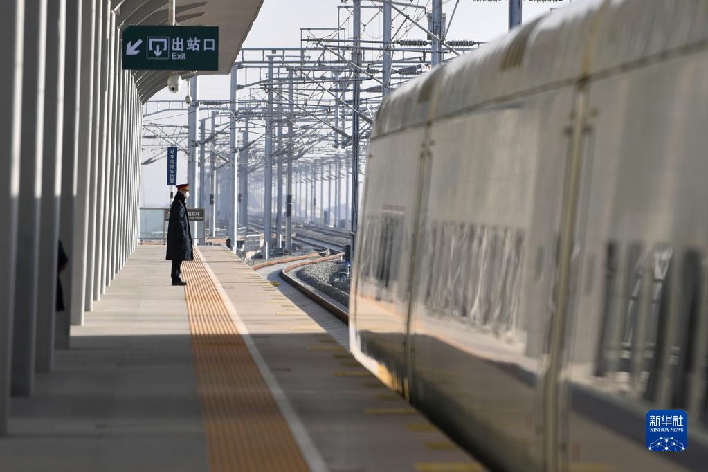 12月26日,一趟試運行動(dòng)車(chē)組列車(chē)駛入銀蘭高鐵秦王川站。