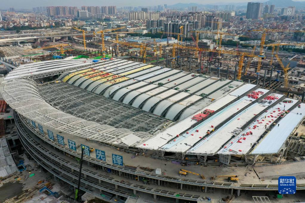 廣州白云火車(chē)站項目一期金屬屋面和二期主體結構建設現場(chǎng)(無(wú)人機照片,12月27日攝)。