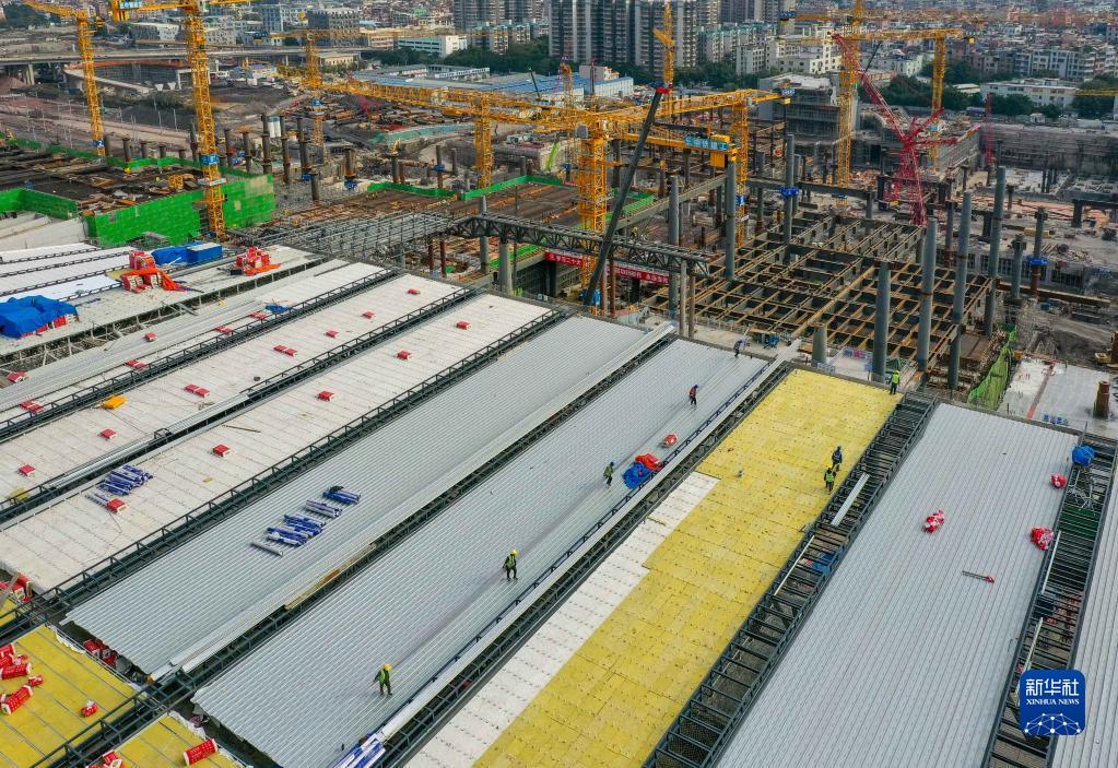 建設者在廣州白云火車(chē)站項目進(jìn)行一期金屬屋面施工(無(wú)人機照片,12月27日攝)。