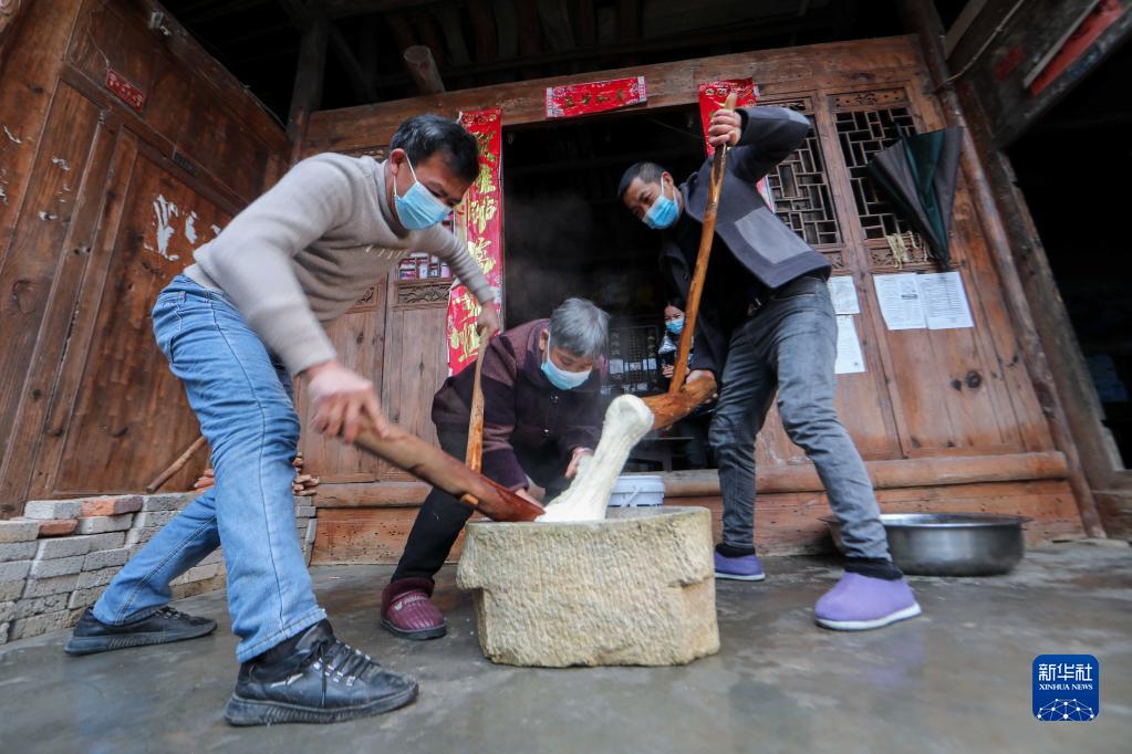 12月27日,岑鞏縣水尾鎮馬家寨村村民在打糍粑。