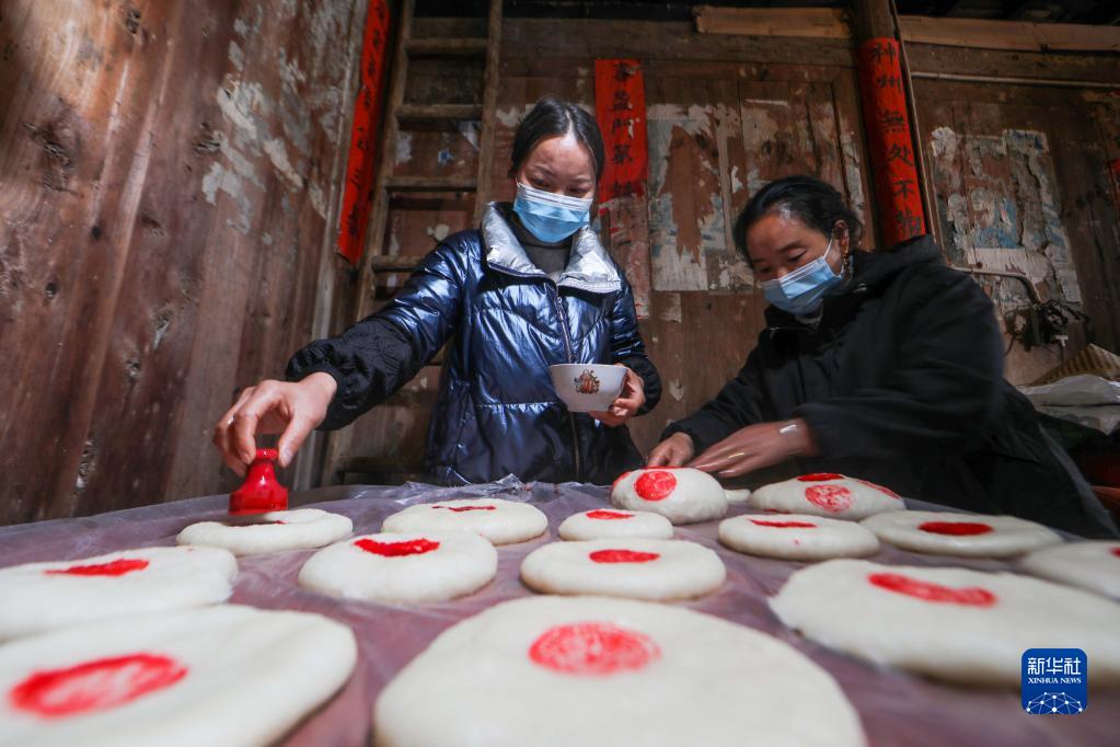 12月27日,岑鞏縣水尾鎮馬家寨村村民給糯米糍粑印花。