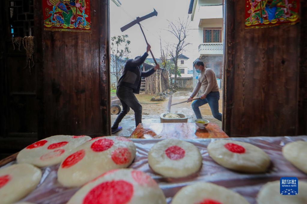 12月27日,岑鞏縣水尾鎮馬家寨村村民在打糍粑。