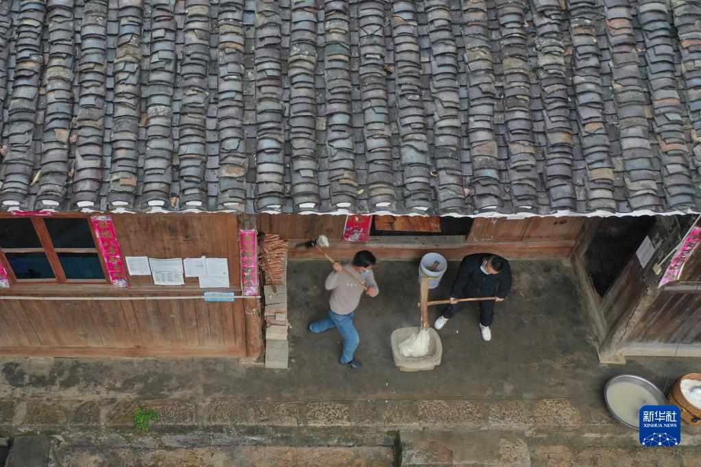 12月27日,岑鞏縣水尾鎮馬家寨村村民將糯米搗成糯米糍粑(無(wú)人機照片)。