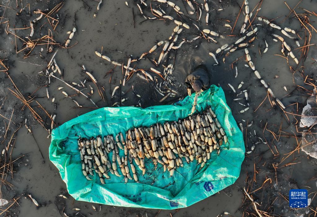 12月28日,在新河縣新河鎮白穴口村蓮藕種植基地,農民冒著(zhù)嚴寒采挖蓮藕(無(wú)人機照片)。
