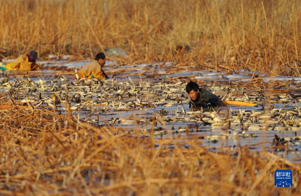 12月28日,農民在新河縣新河鎮白穴口村蓮藕種植基地冒著(zhù)嚴寒采挖蓮藕。